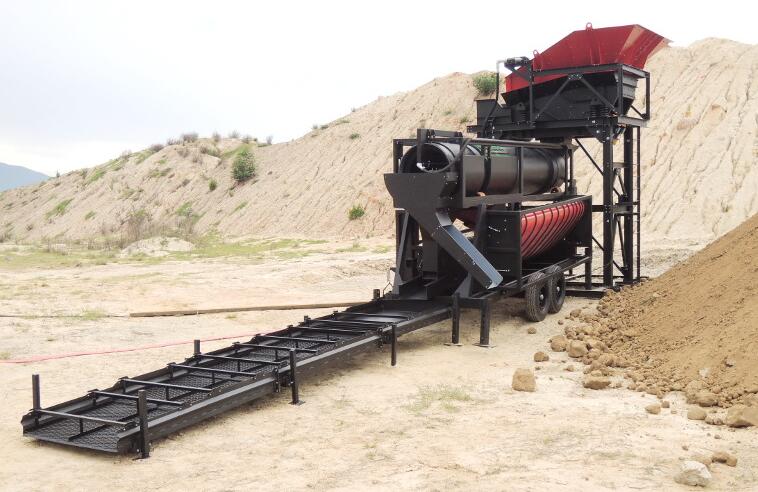礦料經(jīng)過料斗進(jìn)入振動(dòng)篩,經(jīng)過篩分后大石塊廢料排棄,以免進(jìn)入滾筒篩對(duì)其造成損傷,然后再進(jìn)入滾筒篩進(jìn)行洗礦、磨礦,對(duì)礦料進(jìn)行擦洗.經(jīng)過摩擦洗礦后廢料、雜草、樹根等廢物排出,含金的礦料進(jìn)入溜槽或其它選礦機(jī)內(nèi)進(jìn)行選金。